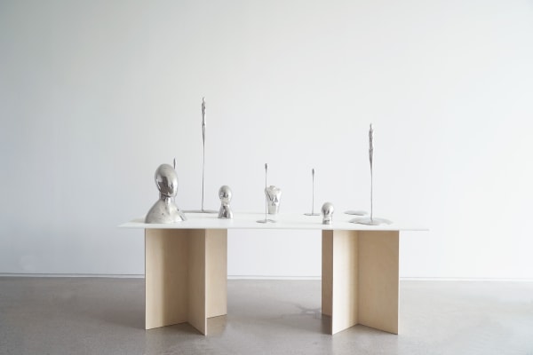 Lee Yun-bok uses stainless steel to create human forms. He shapes them by hammering and completes the bodies through extensive polishing. The smooth curves and sparkling surfaces reveal a seemingly flawless appearance while also displaying the laborious process of polishing, embodying the hardships inherent in a complete existence.
